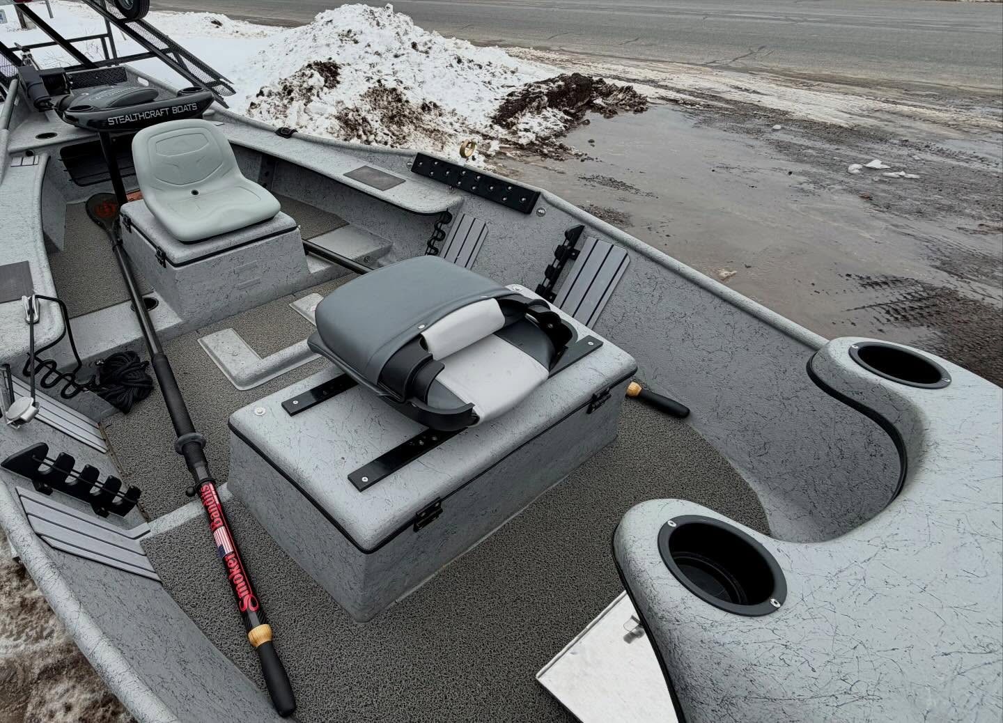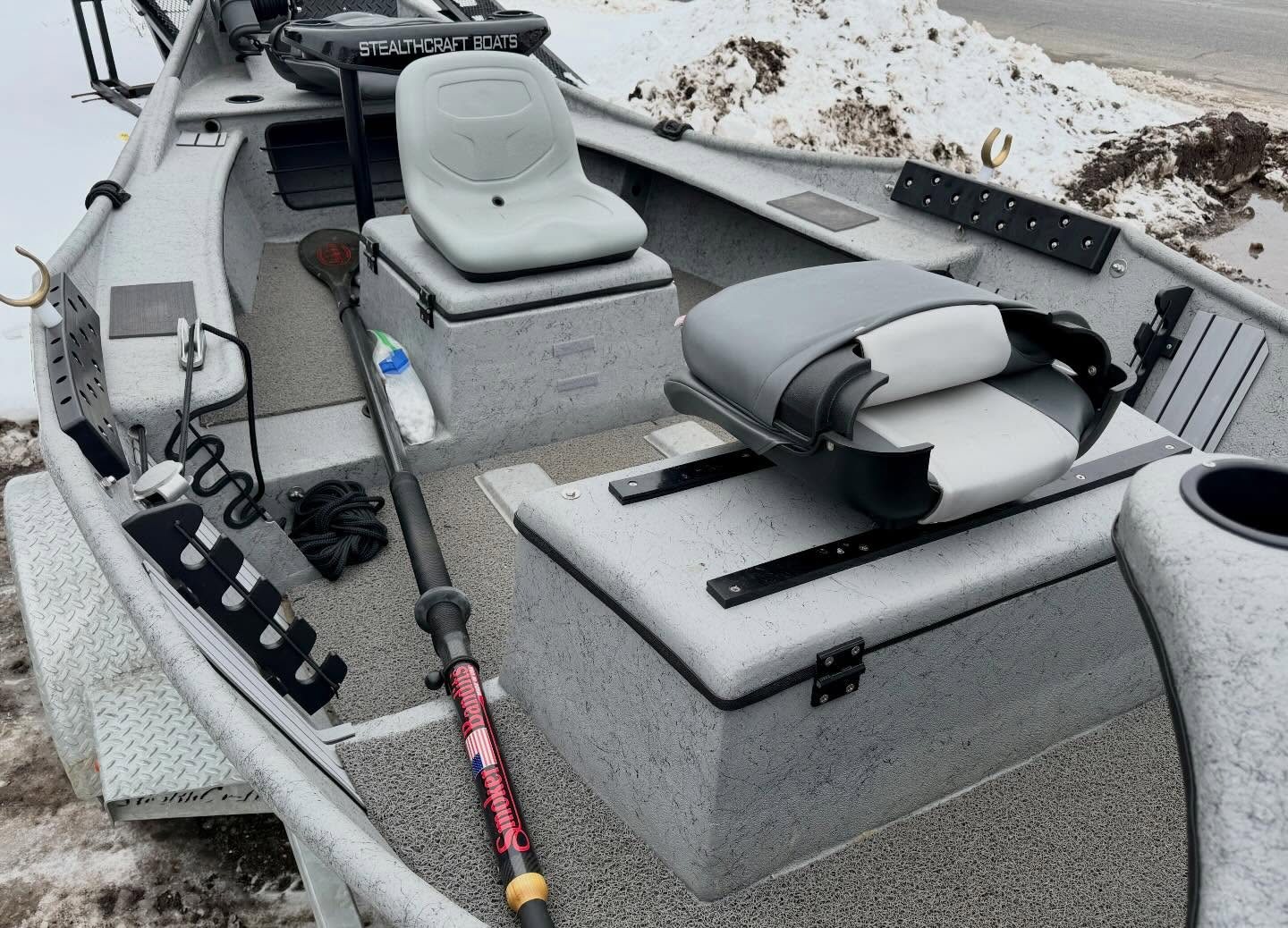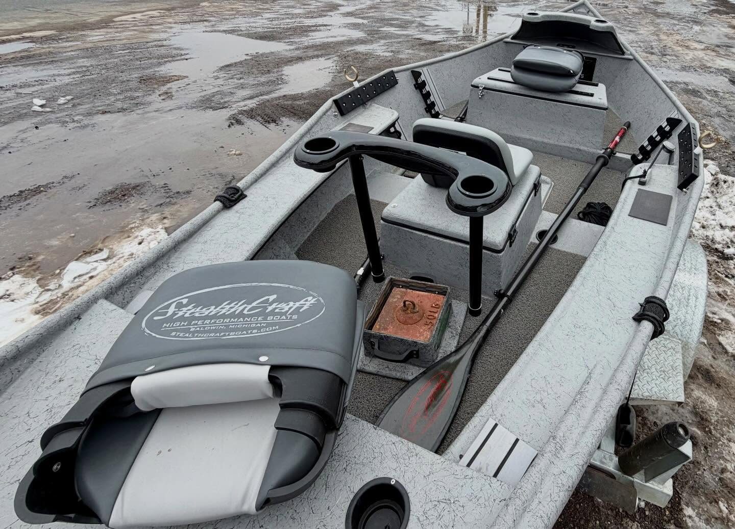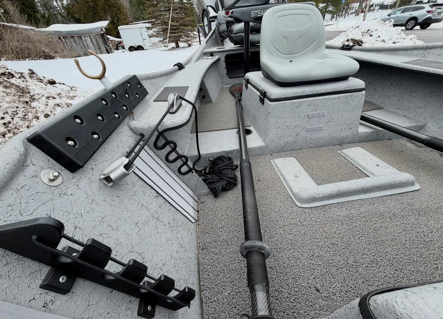 BOAT – Double Box up front with seating for 1 or 2, Double trays spots and golf tubes for up to 8 rods, Sawyer Bandit Oars, Spaghetti Matt, and Cover.