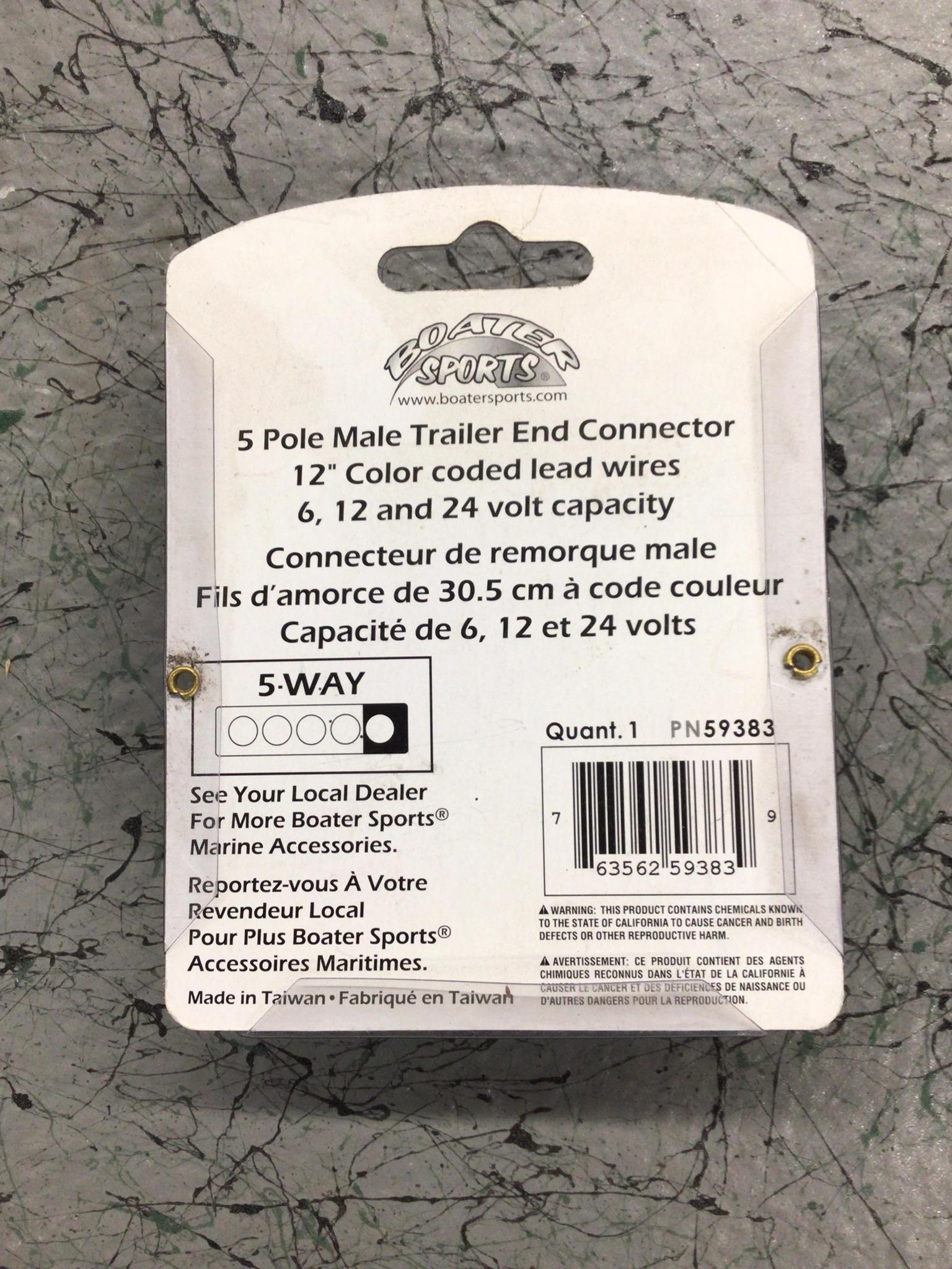 Home / Store / Parts and Accessories / Male Trailer Connector Male Trailer Connector$10.00 Male Trailer Connector quantity Add to cart Category: Parts and Accessories Description Additional information Description 5 Pole Male Trailer End Connector 12″ Color coded lead wires 6, 12, and 24 Volt capacity Additional information Weight 0.5 lbs Dimensions 3.75 × 1.25 × 4.75 in Related products Seachoice Starport Accessory Rail Base (Model 89921) $28.95 Add to cart Attwood Heavy Duty Rod Holder (Black) $43.59 Add to cart Taco Marine Bungee Rod Holder $49.99 Add to cart Drain Plug – Large $8.00 Add to cart