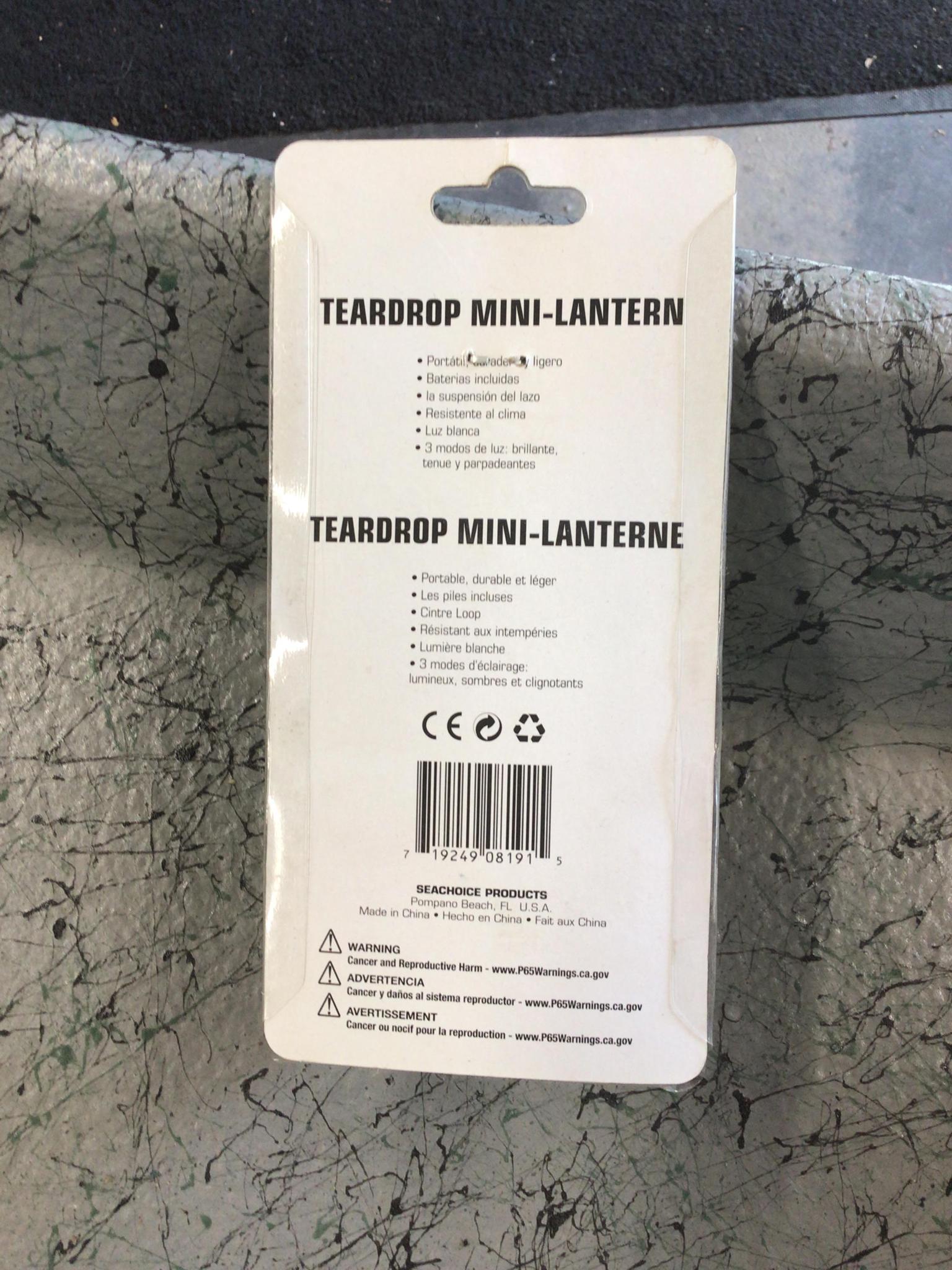 Home / Store / Parts and Accessories / Teardrop Mini Lantern (Seachoice) Teardrop Mini Lantern (Seachoice)$5.95 Teardrop Mini Lantern (Seachoice) quantity Add to cart Category: Parts and Accessories Description Additional information Description Portable, durable, and lightweight. Batteries included Loop hanger Weather resistant White light 3 light modes: bright, dim, and flashing Additional information Weight 0.5 lbs Dimensions 3.75 × 2.25 × 7.25 in Related products Drain Plug – Small $8.00 Add to cart Taco Marine Bungee Rod Holder $49.99 Add to cart Folgers Advantage Quick Release Rod Holder $57.99 Add to cart Seachoice Fuel Connector (Model 20571) $12.75 Add to cart